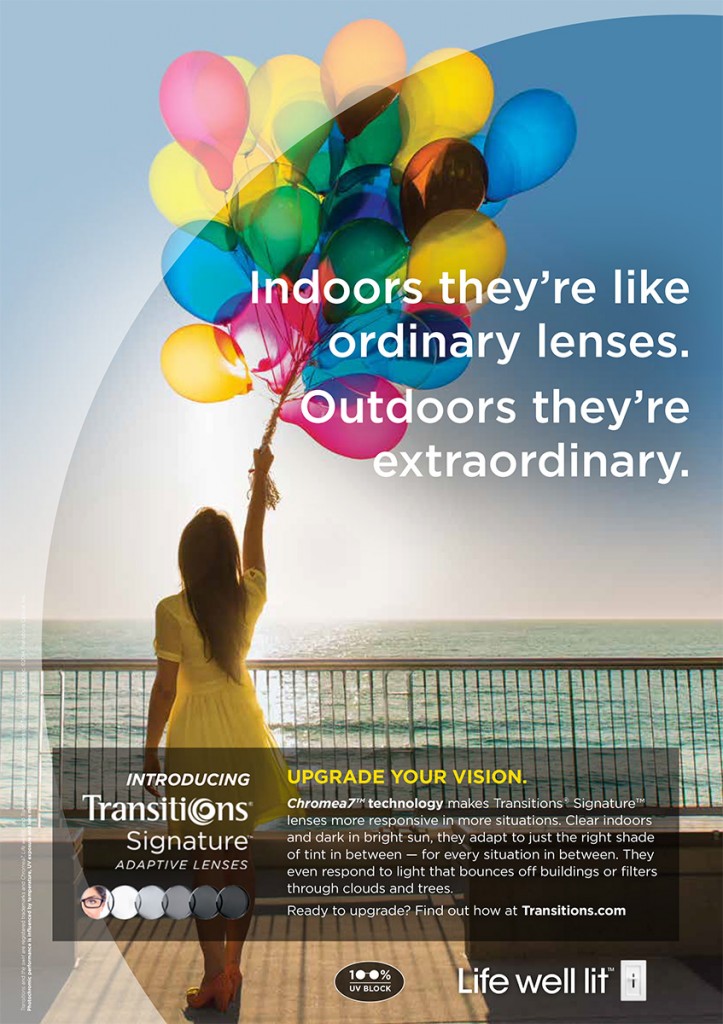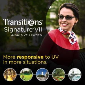 Transitions Signature (Transitions Optical) — Transitions Signature lenses (also called Transitions Signature VII lenses) represent the seventh generation of Transitions photochromic lenses. Introduced in 2014, Transitions Signature lenses are available in a wide variety of lens materials and designs, in either a gray or brown light-adaptive tint. The lenses are clear indoors, get 15 to 21 percent darker outdoors than previous Transitions lenses, and are preferred 2-to-1 over previous-generation Transitions lenses, according to the company.